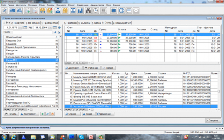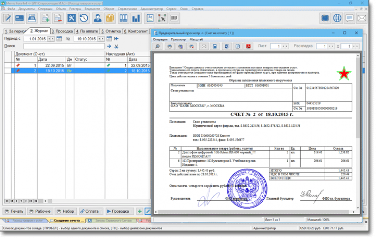 Полный комплект оперативных документов, раздельный учет товарных остатков по отделам (складам), учет номерных экземпляров товаров, ценообразование в трех валютах (рубли, USD, EURO), работа с заказами и комплектация составных изделий. Оперативная информация по долгам контрагентов, заказам, оплате накладных и оборотам товаров и услуг. Универсальный передаточный документ. Учет заказов Сервисного Центра.