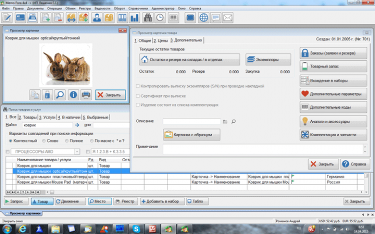 Поддержка работы со сканером штрих - кодов, выписка сканером товаров и экземпляров по серийным номерам, настройка и разделение прав пользователей на доступ к информации. Поддержка обмена прайс-листами и пакетами документов между различными копиями БД программы для организации удаленной и мобильной торговли. Реализованы элементы CRM систем: ведение историй общения с контрагентами, просмотр документов и печать реестров по проведенной работе с контрагентами. Ведение списков аналогов и замен товаров. Поддержка национальных валют стран СНГ (Таджикистан, Украина, Казахстан, Молдавия, Узбекистан).