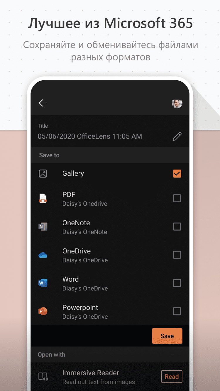 Приятной особенностью приложения является возможность сохранения отсканированных изображений как в памяти мобильного устройства, так и в OneNote и OneDrive.