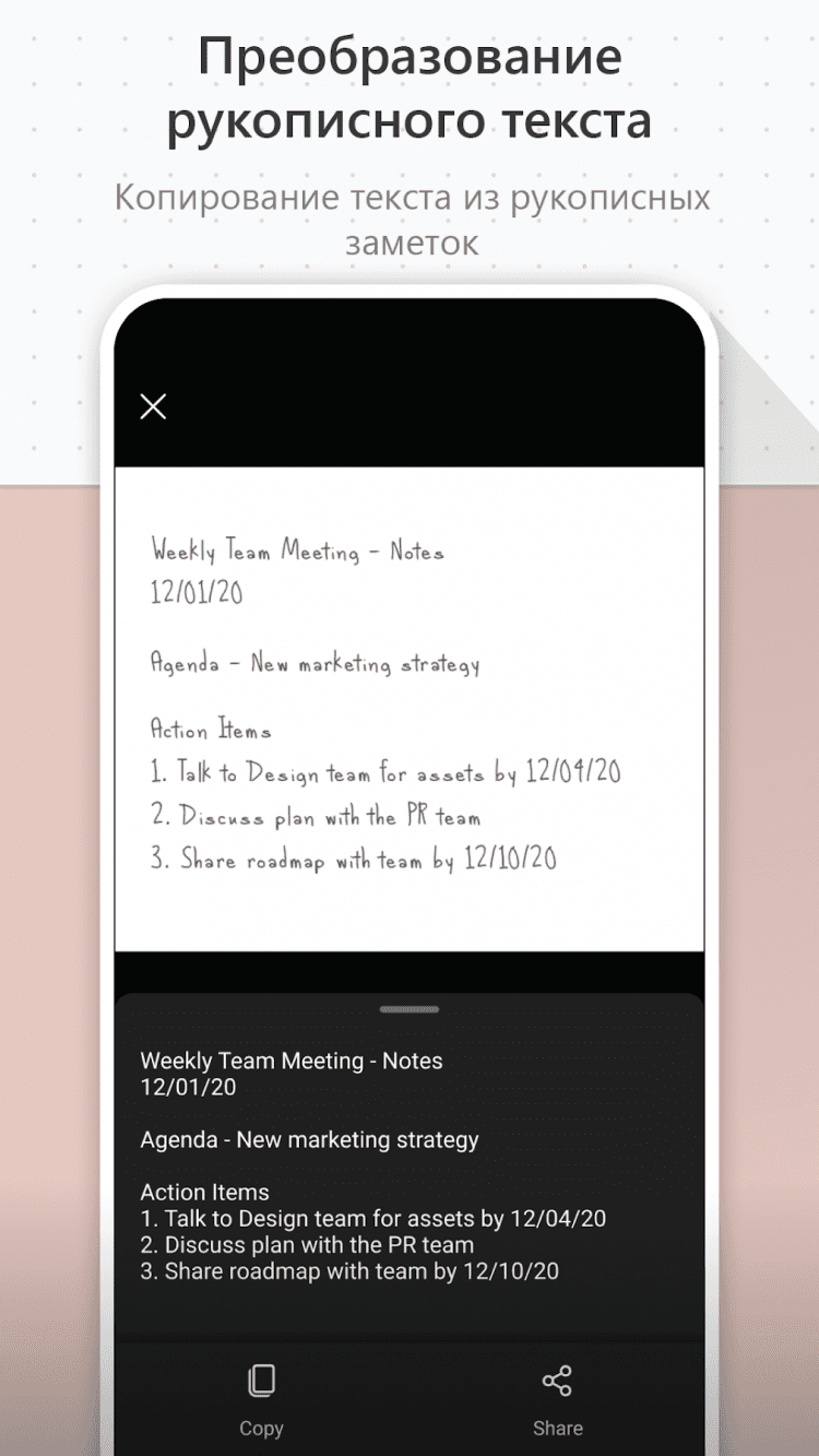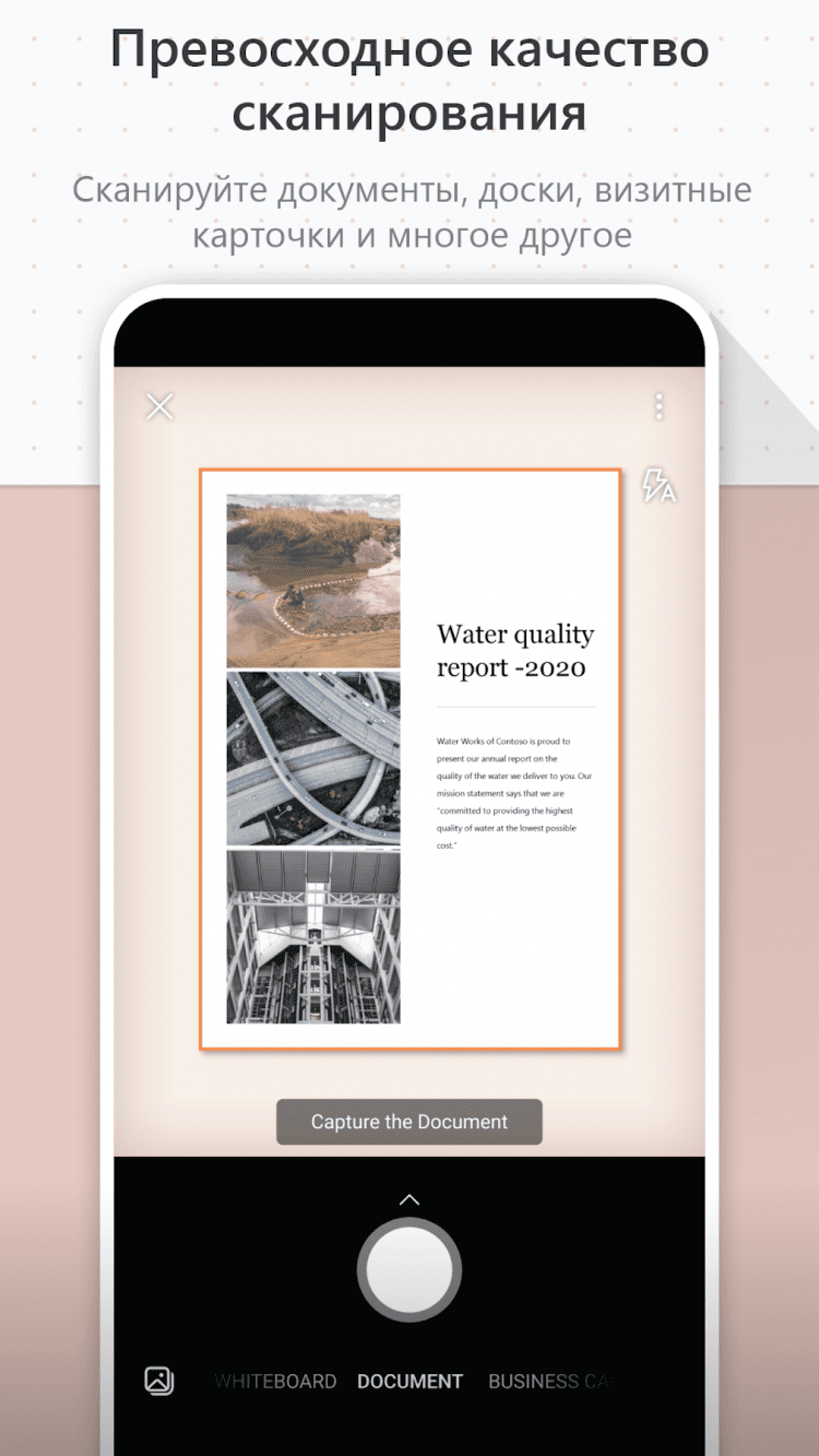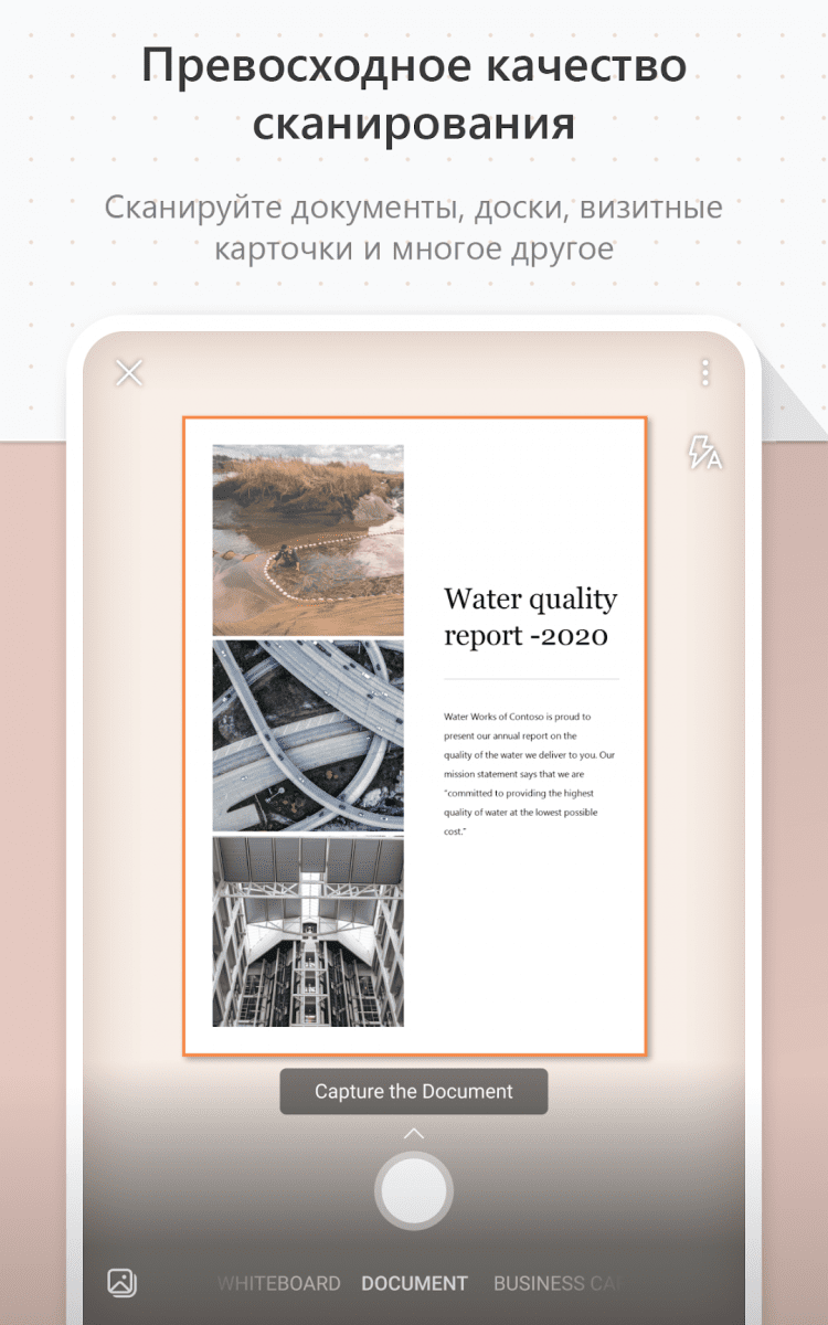 Office Lens позволяет делать снимки важных бумаг и записей на досках, а также создавать цифровые копии печатных документов. После создания копии, вы сможете обрезать их, а так же выборочно копировать или изменять текст, благодаря поддержке OCR (функции распознавания текста).