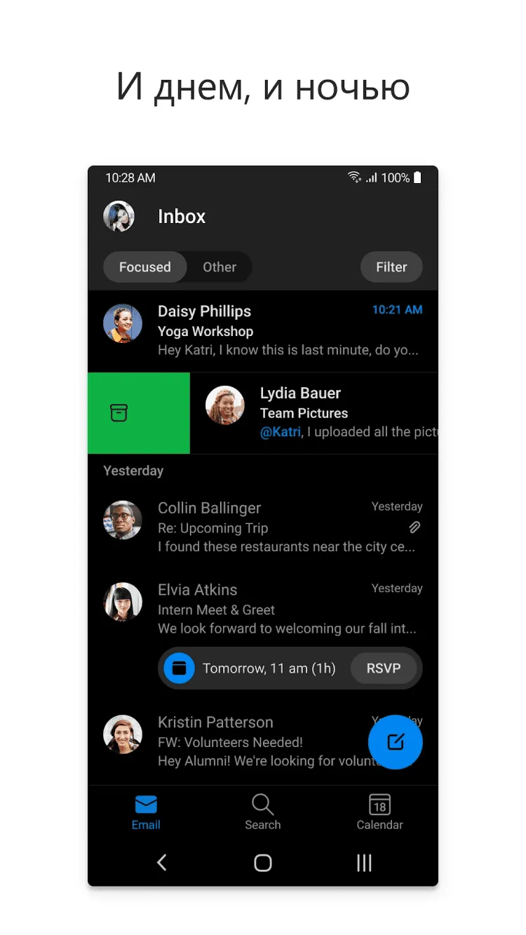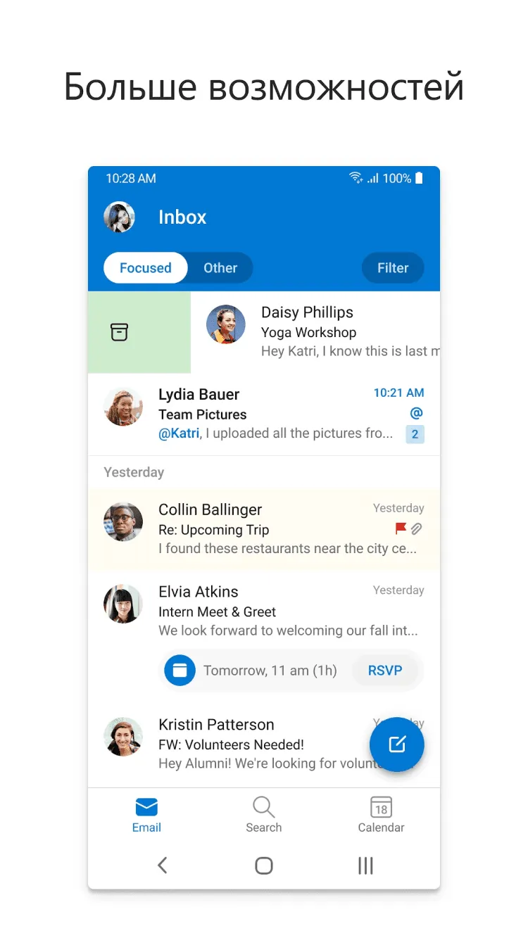 Приложение Microsoft Outlook автоматически сортирует почтовый ящик, выделяя самые важные сообщения, помещая менее важные в раздел "прочие", позволяет прикреплять к письмам файлы с OneDrive, Dropbox и прочих хранилищ всего в один клик и отправлять большие файлы, даже без их скачивания на ваше устройство. Управлять письмами невероятно легко благодаря поддержке удобных жестов. Так же, это приложение обладает встроенным календарем и позволяет настраивать уведомления о важных событиях.