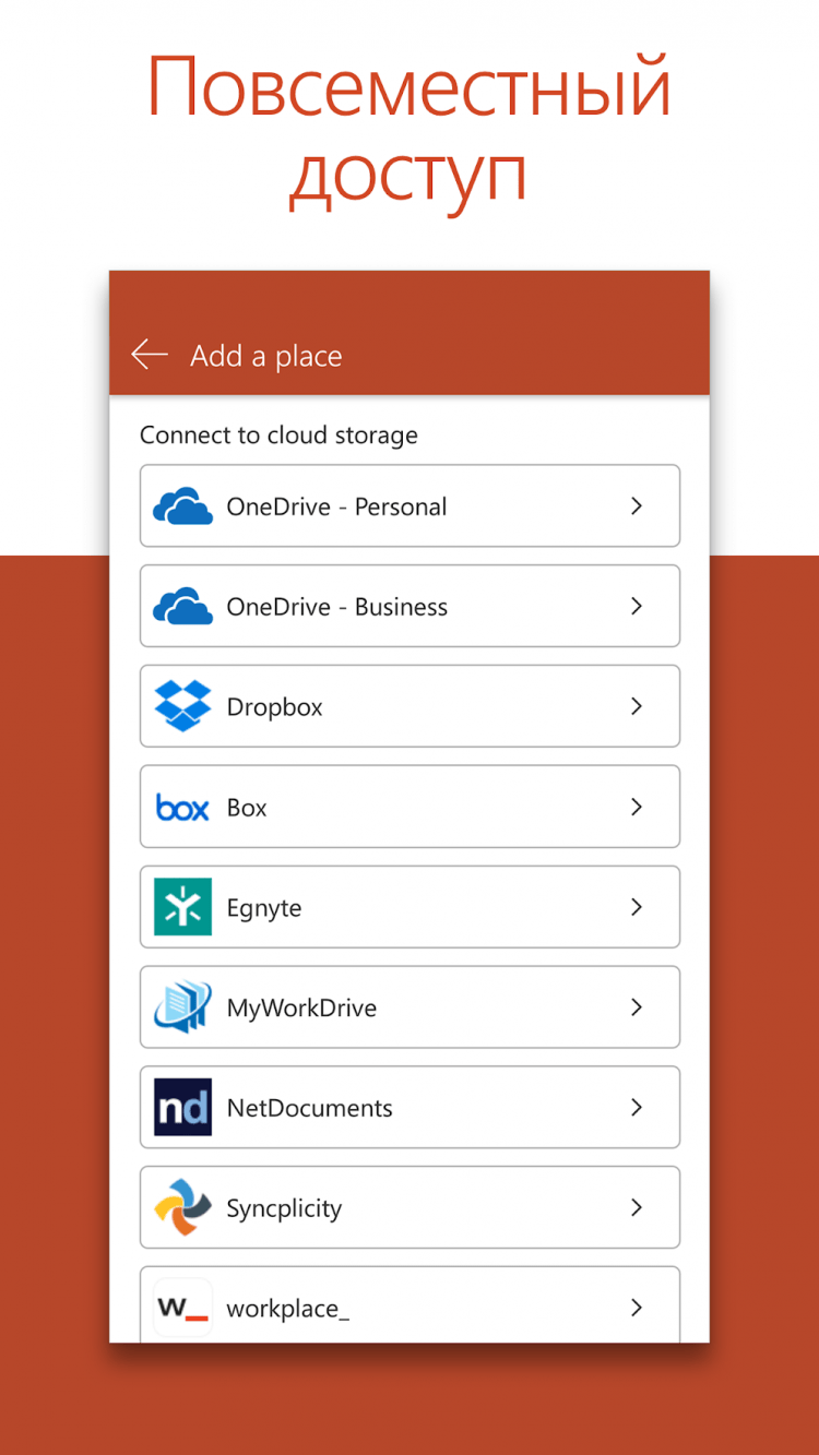 С помощью этой программы, работать над презентациями можно как дома или на работе, так и во время прогулки или в любом другом месте. При этом, форматирование, оформление и содержимое презентаций останется неизменным на любых устройствах. Это означает, что при просмотре презентации на компьютере, вы будете видеть ровно то, что видели на экране своего смартфона или планшета. К тому же, вы сможете сохранить созданные проекты на OneDrive, One Drive для бизнеса, SharePoint, Google Drive, Box или Dropbox, чтобы получить к ним мгновенный доступ с любого из своих устройств.