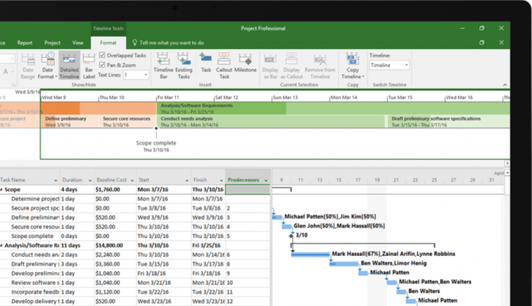 В дополнение к этому, Microsoft Project позволяет отмечать текущие задачи как частично или полностью выполненные, добавлять итоговые или промежуточные отчёты на временную шкалу, а также импортировать списки задач из Outlook.