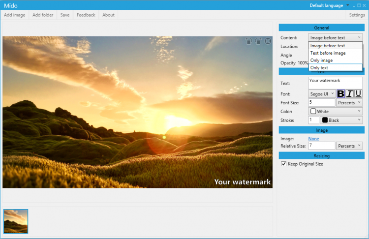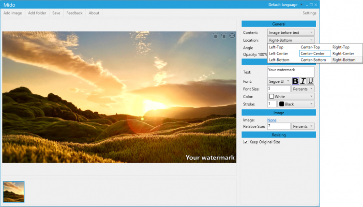 Mido - это программа для наложения водяных знаков на изображения. С ее помощью вы сможете защитить фотографию, иллюстрацию и другие изображения, используя текстовый, графический или комбинированный водяной знак. Программа поддерживает пакетный режим обработки изображений, что позволяет сэкономить время и силы, когда изображений много.