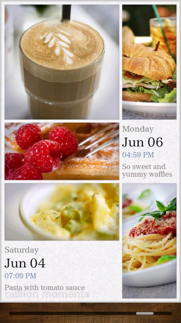 Million Moments Приложение для просмотра фотографий и обмена ими, которое позволяет вам и вашим друзьям наслаждаться любимыми картинками на элегантных, словно журнальных страницах. Каждая перевернутая страница будит собственные воспоминания. Картинки накапливаются в вашем смартфоне. Не позволяйте дорогим воспоминаниям затеряться в забытом закоулке вашего телефона. Делайте снимки, импортируйте и просматривайте их. Это прекрасный и легкий способ воскрешать в памяти любимые моменты.
