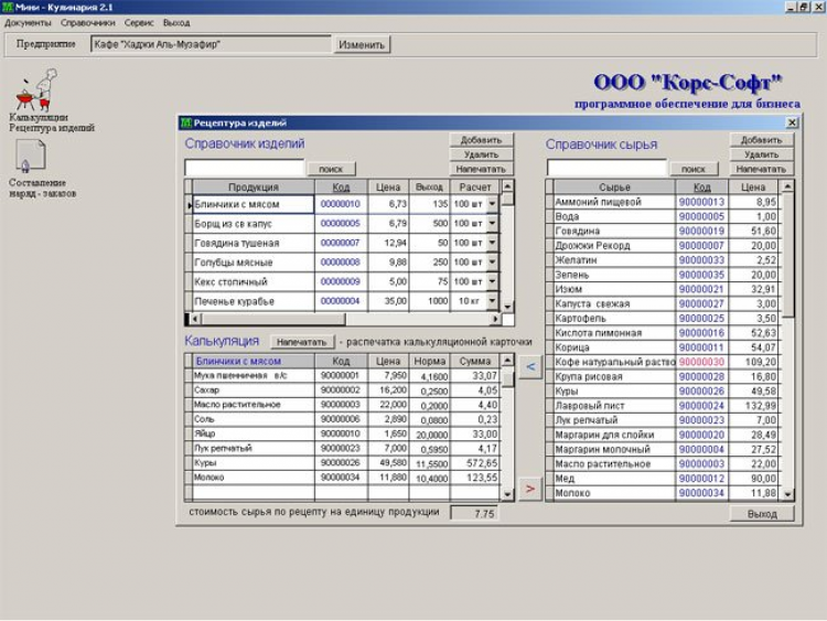 Мини Кулинария - это полезная, простая и удобная бесплатная программа для учета производства продуктов питания, полуфабрикатов и т.д. Подходит для кулинарий, кондитерских цехов, столовых, кафе, ресторанов.