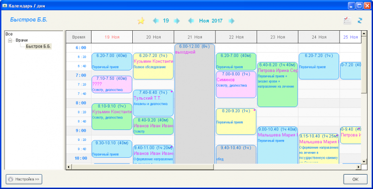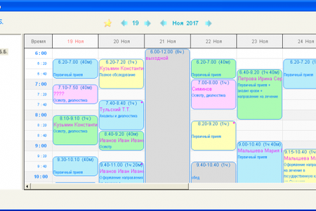 Гибкая система записи и учета приемов врача, режим визуальной записи на прием (Календарь), выделение различными цветами в зависимости от типа приема, настраиваемый временной график врача, учет клиентов, учет оказанных медицинских услуг, учет оплат. Расписание разбито на временные интервалы в соответствии с параметрами выбранного врача (параметры задаются в справочнике врачей): интервал часов работы (например, с 9.00 до 15.00) "шаг" часовой сетки (например, 20 минут) Таким образом, программа позволяет для каждого врача определять персональный график работы и интервал "разбивки" часовой сетки. Первая колонка в Календаре определяет временной интервал. При этом, часы работы, соответствующие текущему графику работы врача, выделяются синим цветом, а не соответствующие - бордовым. Как правило, отображаются только рабочие часы из графика врача, но в случае наличия приемов в не рабочее время, временная сетка "расширяется" так, чтобы отобразить все приемы на выбранные даты. Каждая колонка в Календаре (начиная со второй), определяет конкретный день в расписании. Занятый интервал на прием одного из клиентов выделяется цветом и содержит ФИО клиента. Например, клиент "Симонов А.А." записан на 28 августа на 40 минут с 10.00. Цвет заполнения соответствует конкретному типу приема, например, голубой - для первичного приема, желтый - для процедур и т.п. Типы и их цвета можно менять произвольным образом (режим Справочники - Типы приема).