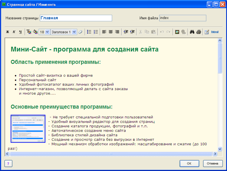 Мини-Сайт - это программа быстрого создания сайта. Профессиональный вид сайта. Неограниченное количество Интернет-страниц. Автоматическое создание меню сайта. Встроенный визуальный HTML-редактор. Каталог товаров, услуг. Обработка фотографий для каталога. Выгрузка по FTP. И многое другое. Для любых пользователей, не требует знания HTML и т.п.