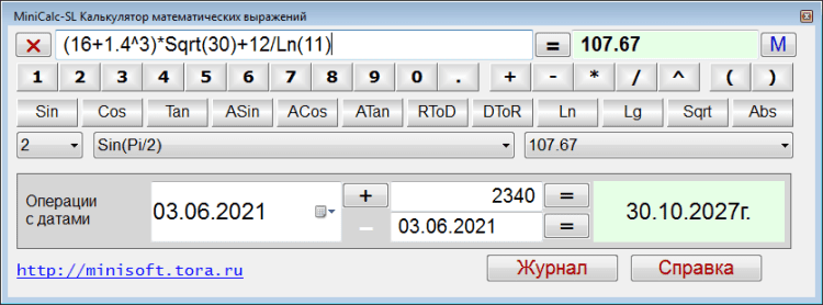 MiniCalc-SL - это программа калькулятор для расчета математических выражений предназначена для вычисления арифметических, алгебраических выражения, и может использоваться как калькулятор логарифмов и тригонометрический калькулятор. В программу включены операций с датами. Включены следующие тригонометрические и логарифмические функции: синус, косинус, тангенс, арксинус, арккосинус, арктангенс, десятичный логарифм, натуральный логарифм. Вычисляемые математические выражения могут быть различной длины и содержать выражения в скобках.
