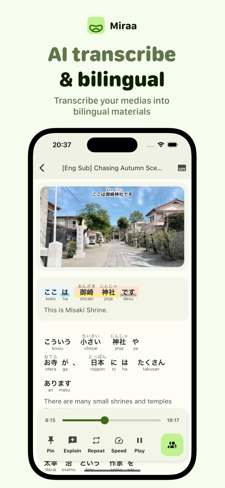 Эта программа — прекрасное доказательство того, что обучение может идти рука об руку с развлечениями. Забудьте об учебниках с бесконечными заданиями и занимайтесь любимым делом, одновременно изучая новые слова на интересующем вас языке. Работает это так: вы смотрите любимые видео или слушаете подкасты, а Miraa с помощью передового инструмента на основе искусственного интеллекта сгенерирует для вас субтитры на языке оригинала, а также на понятном вам языке. У вас есть вопросы или вы не можете разобраться в материале? Не проблема: Miraa объяснит сложные моменты понятным языком. Остались вопросы? Благодаря встроенному чату с ИИ вы сможете быстро получить помощь и задать все интересующие вас вопросы.