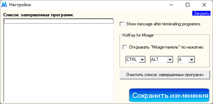 Mirrage - это программа, которая предназначена для быстрого закрытия окон системы. Вся особенность этой программы заключается в том, что закрытие окон происходит комбинацией кликов мышью, либо клавиш. Mirrage можно так же использовать и для закрытия зависших окон и неотвечающих на запросы приложений.