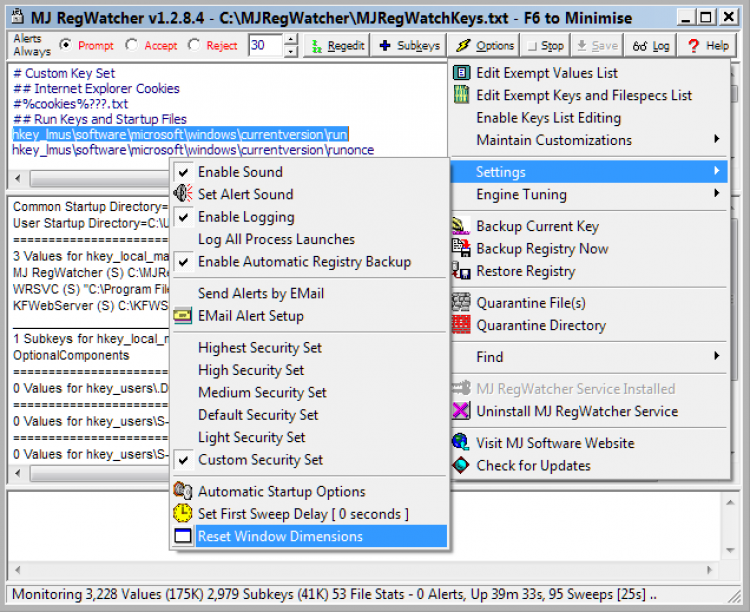 MJ Registry Watcher - это простенькая программка, которая отслеживает происходящие в реестре ОС Windows изменения. Помимо реестра она так же может "приглядывать" и за другими системным файлами. Она позволяет блокировать доступ к выбранным системным файлами и ведет журнал всех изменений.