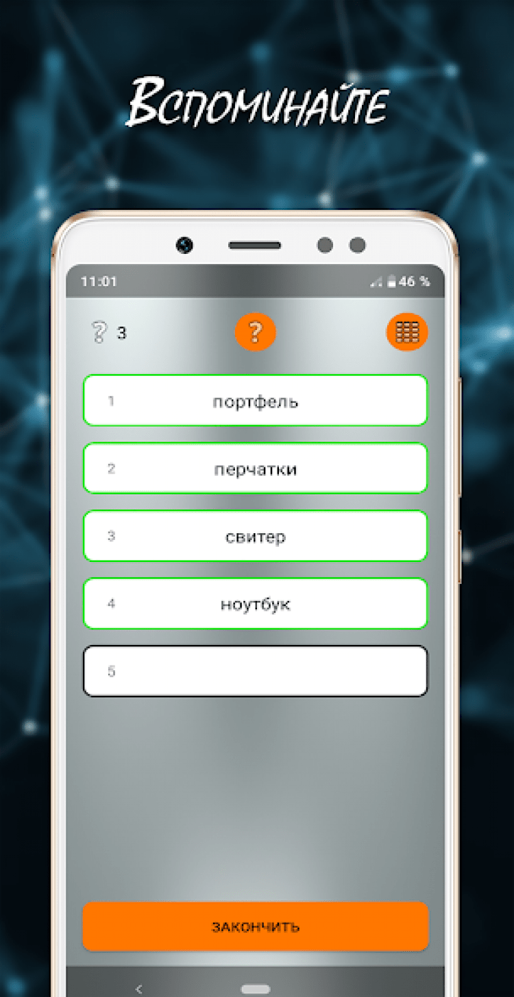 Эта программа предлагает вам развить свою память естественными наиболее эффективным способом — путём запоминания слов. При прохождении хотя бы нескольких уровней ежедневно, в скором времени, вы сами будете замечать результат. Тренировки проходят в приятной игровой форме, а благодаря мотивирующим напоминаниям о занятиях, вы не пропустите дневную порцию развивающих заданий. По мере прохождения игры, задания в программе будут усложняться и добавится ограничение по времени. При желании, последнее можно отключить в настройках. Приятным дополнением станет возможность выбрать из нескольких игровых режимов, чтобы тренировать память, наиболее приятном и удобном для вас способом.