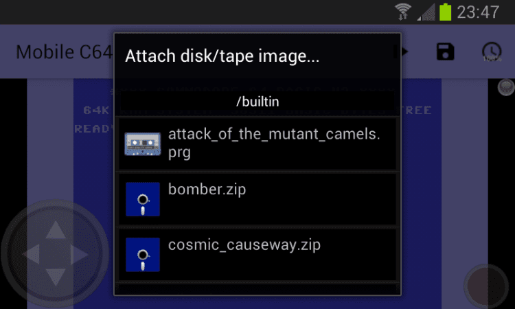 Mobile C64 (Lite) Эмулятор всем знакомого Commodore 64 для вашего мобильного устройства с поддержкой экранной клавиатуры.Приложение включает в себя несколько игр: Elite, Kickstart oder Attack of the Mutant Camels. Вы так же можете скачать и другие игры, сохранить их на SD-карту вашего устройства и затем запускать в данном приложении. Играйте в любимые игры в любом месте, при помощи своего мобильного.