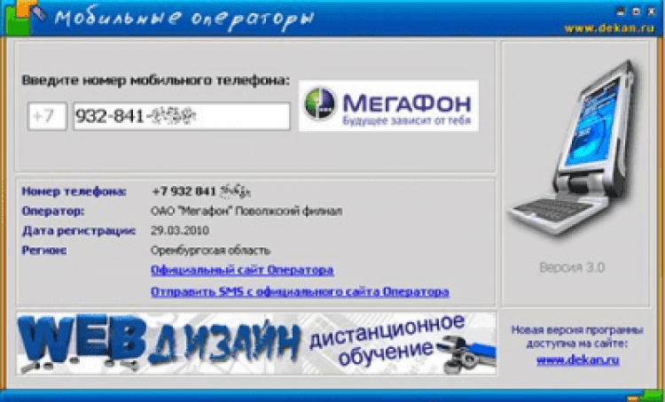 Прежде, чем звонить на мобильный телефон, настоятельно рекомендуем узнать с помощью данной программы, какому региону и оператору мобильной связи принадлежит указанный в объявлении номер. Иначе может случиться так, что ваш звонок (в другой регион) обойдется вам слишком дорого. Кроме того, вы сможете быстро и просто отправить бесплатное СМС на любой номер.