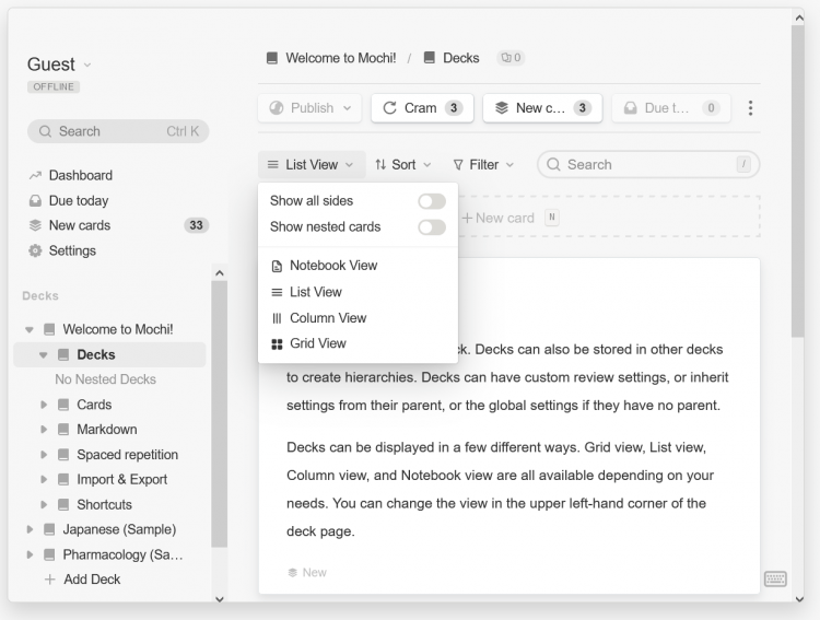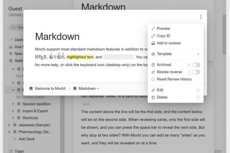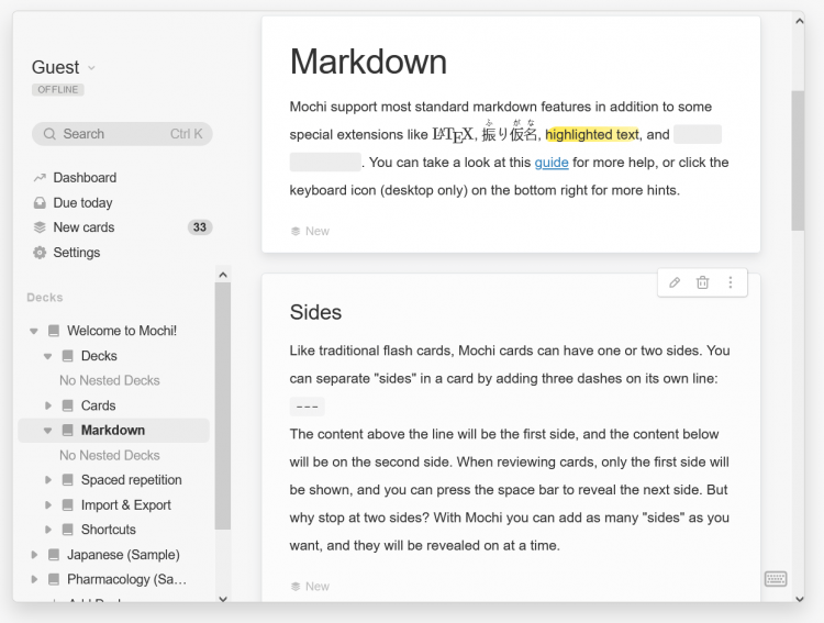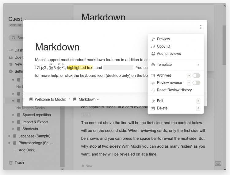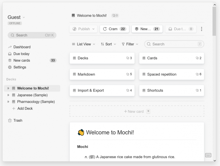 Mochi — это простое, хорошо продуманное приложение, которое является редактором учебных карточек, и вместе с тем может быть использовано для создания и хранения текстовых заметок.