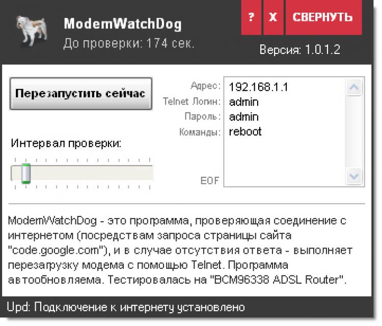 ModemWatchDog ModemWatchDog - это программа, проверяющая соединение с интернетом (посредствам запроса страницы сайта "code.google.com"), и в случае отсутствия ответа - выполняет перезагрузку модема с помощью Telnet. Программа автообновляема. Бывало такое, что поставил на скачку торрент или ещё что-нить (не важно что), сам пошел спать или по делам, а когда возвращаешься, видишь — файл нихрена не скачался, так как пока тебя не было инет оборвался и сам не поднялся? Ставлю стакан молока, что у тебя такое было. Эпоха ADSL модемов ещё не прошла, и поэтому востребована хреновина, что будет проверять доступность инета, и если он сдох - перезагружать модем/роутер.