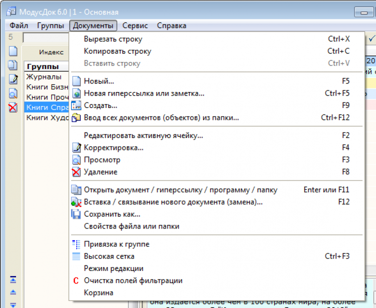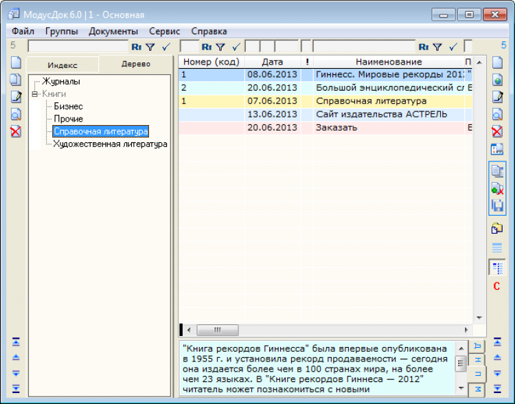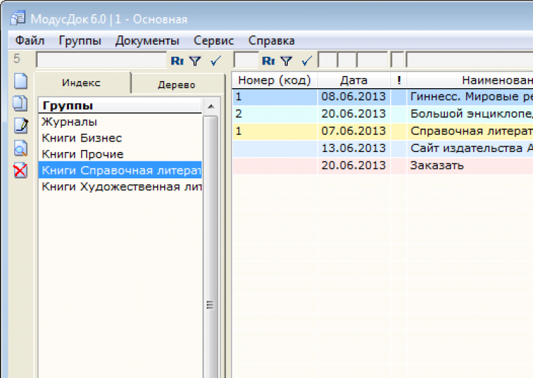 База данных в МодусДок состоит из таблицы групп и таблицы записей. Группы представлены на двух вкладках Индекс (линейная структура) и Дерево (иерархическая структура), причём Дерево генерируется автоматически!