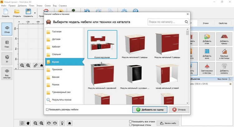 - Создание дома любого вида. ПО позволяет нарисовать произвольный план здания или же загрузить свой чертеж. В первом случае вы делаете проект с нуля и вручную задаете размеры, а во втором — импортируете имеющееся у вас фото или скан. Также в каталоге есть готовые модели домов, которые можно взять в качестве шаблона.