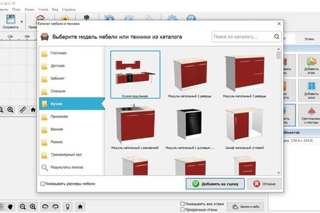Каждый элемент можно как угодно располагать в пространстве. Также легко изменить размер моделей. Это очень удобно, например, если вместо стандартных окон вы хотите установить панорамные. Более того, добавлена функция загрузки собственных материалов — подберите в магазине обои или плитку и добавьте скриншот текстуры в программу.