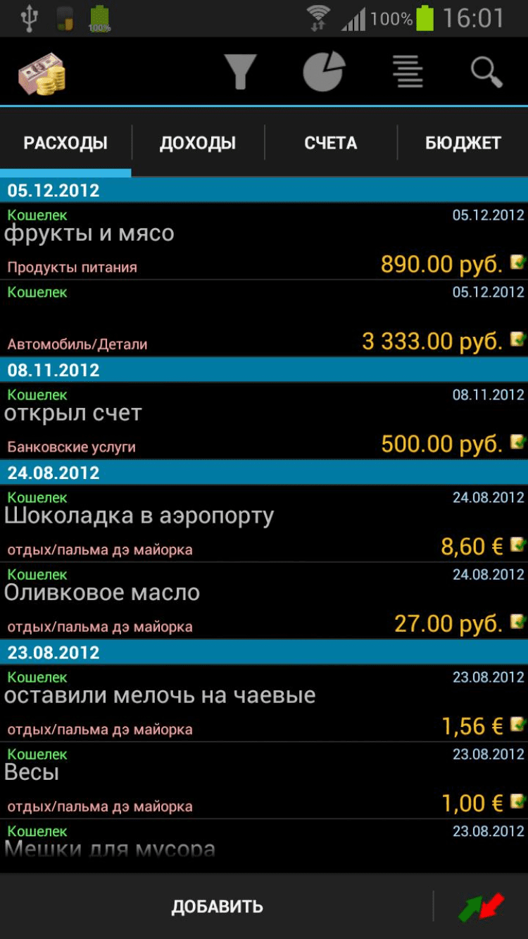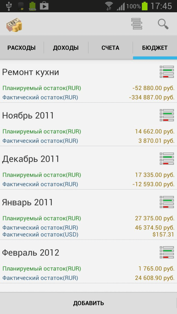 - быстрый поиск (доходов/расходов);
