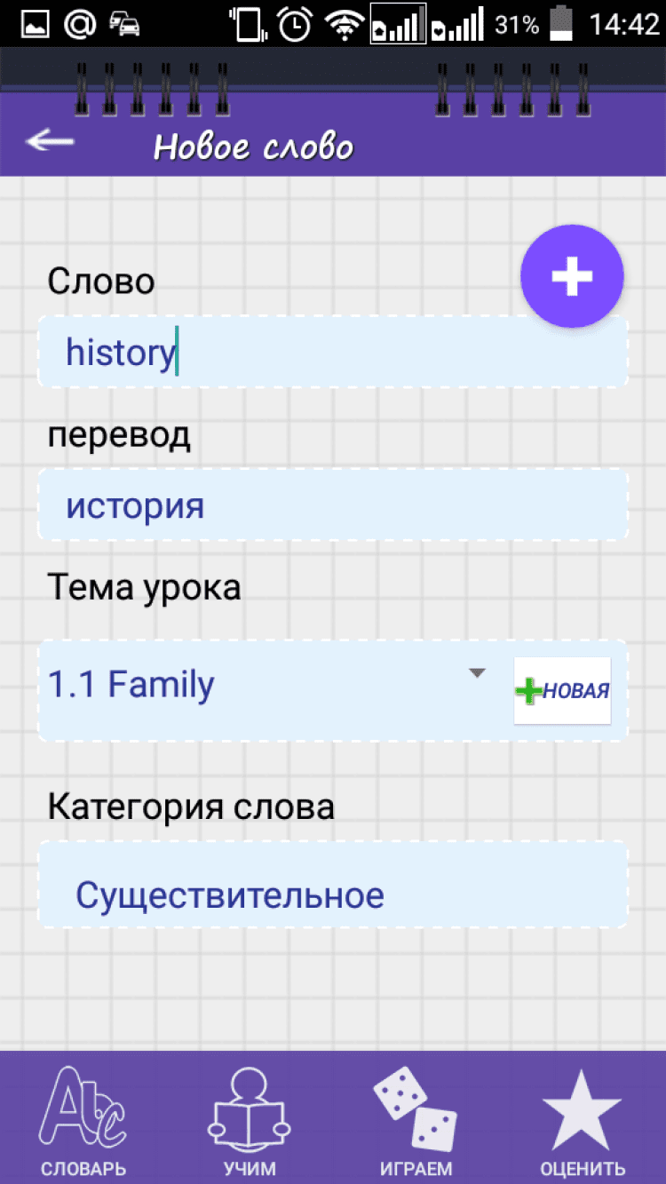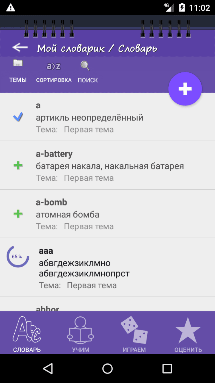 В приложении конечно же есть поддержка тем уроков. Это полезно тем, что, когда Вы изучаете английский язык по учебнику, было легче отделять слова по предложенным темам или главам. Полезно это и тем, кто просто читает книги, и выписывает все новые слова в свой личный словарь, чтобы их легче было повторять. Однако, поддержку тем можно и отключить, если вы учите язык самостоятельно, без учебника, либо считаете, что это просто Вам не нужно.