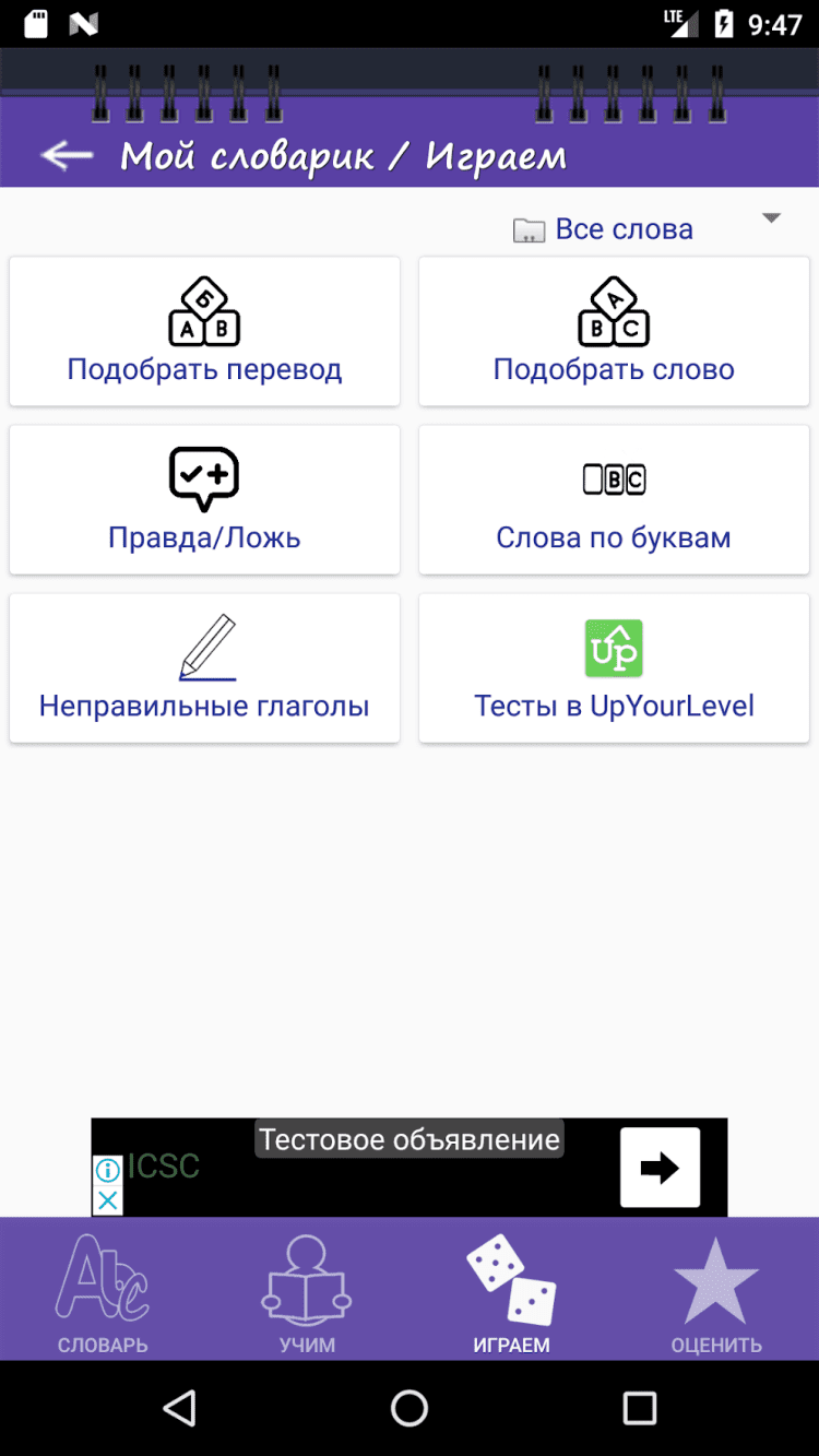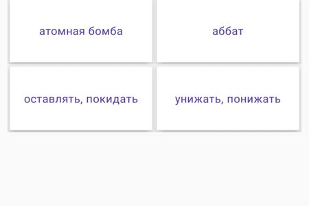 Проверять же знания можно с помощью предложенных нами игр для подбора перевода, самого слова, либо слов вперемешку с правильным или неправильным переводом "Правда/Ложь". Также в приложение добавлена возможность научиться писать слово, которое вы учите в игре "Слова по буквам".
