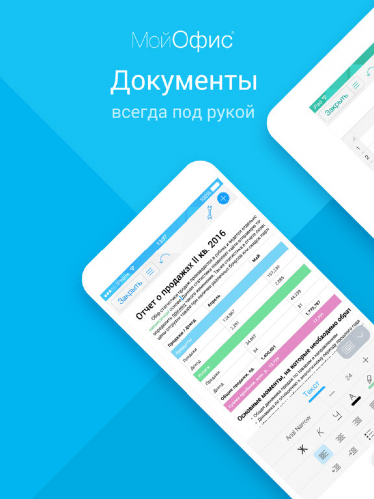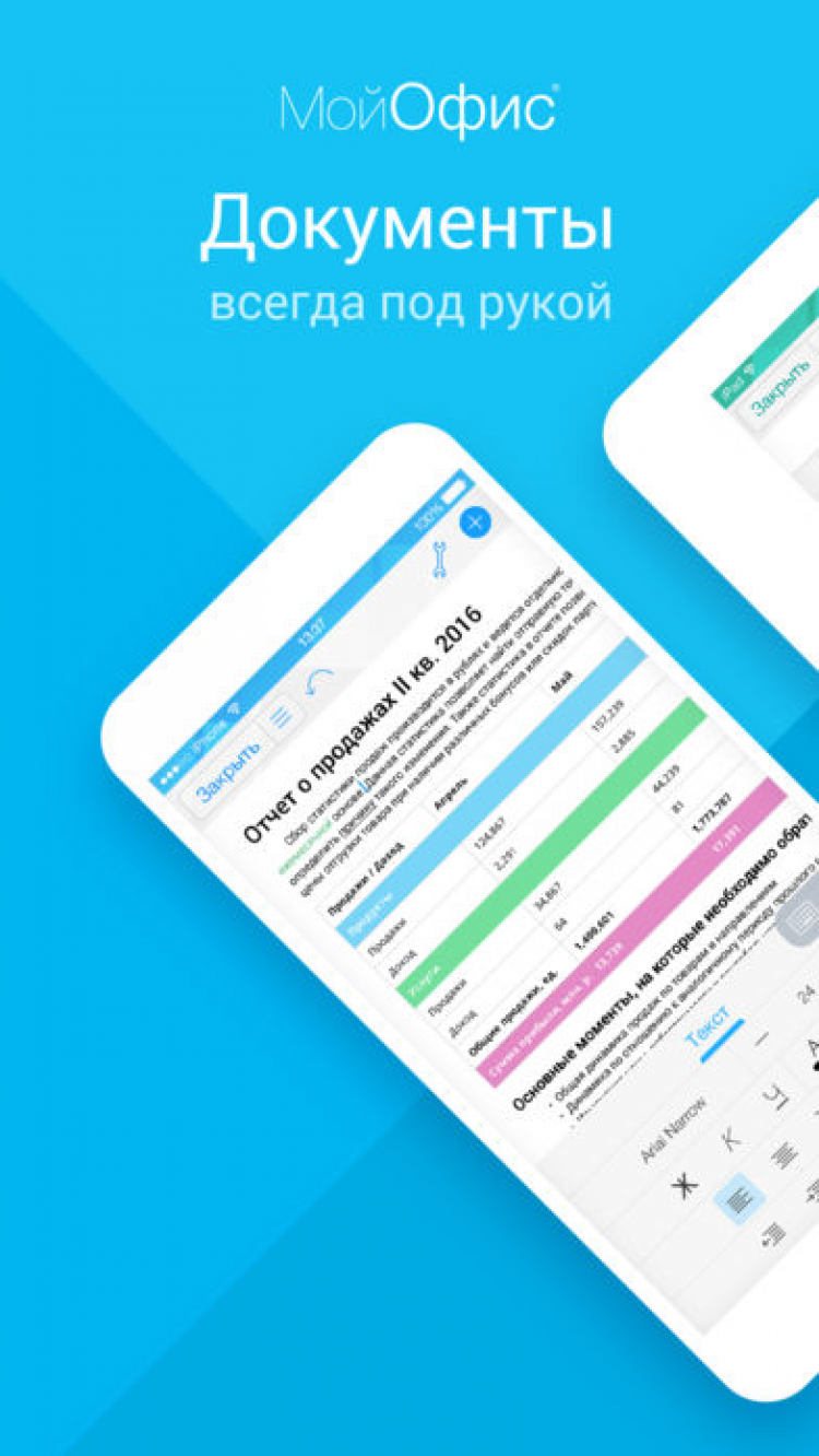 Скачайте МойОфис Документы на свой iPhone или iPad и работайте с документами в любом месте и в любое время и быстро обменивайтесь ими с коллегами через облако.