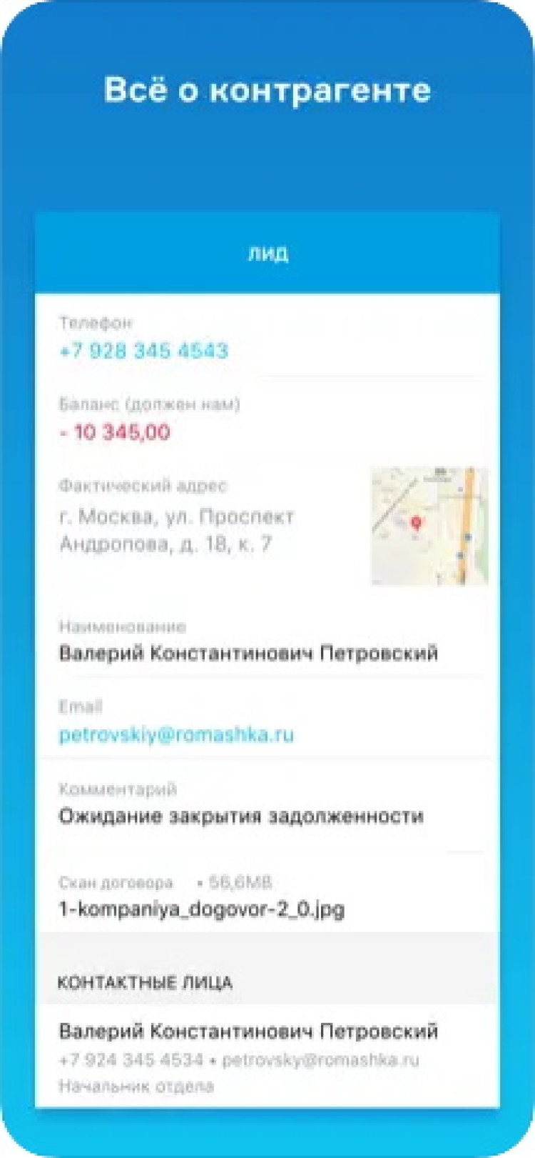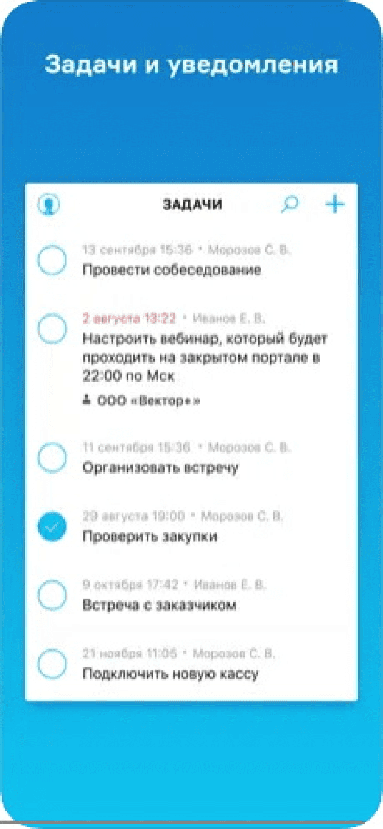 - работа с клиентами, товарами, документами: выставление и отправка счетов, работа с заказами, товарами, контрагентами и задачами;
