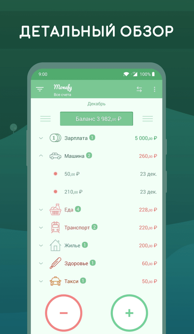 Благодаря Monefy, вы сможете записывать информацию обо всех расходах проще и быстрее, чем когда-либо. Для этого, вам потребуется всего лишь нажать на одну кнопку и заполнить поле суммы. Более ничего заполнять не придётся. Кроме того, статистикой расходов можно быстро и безопасно делиться с родными и близкими, а также синхронизировать данные между устройствами через Google Drive или Dropbox.
