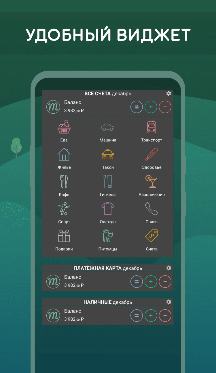 - наличие виджетом для быстрого внесения новой информации о расходах;