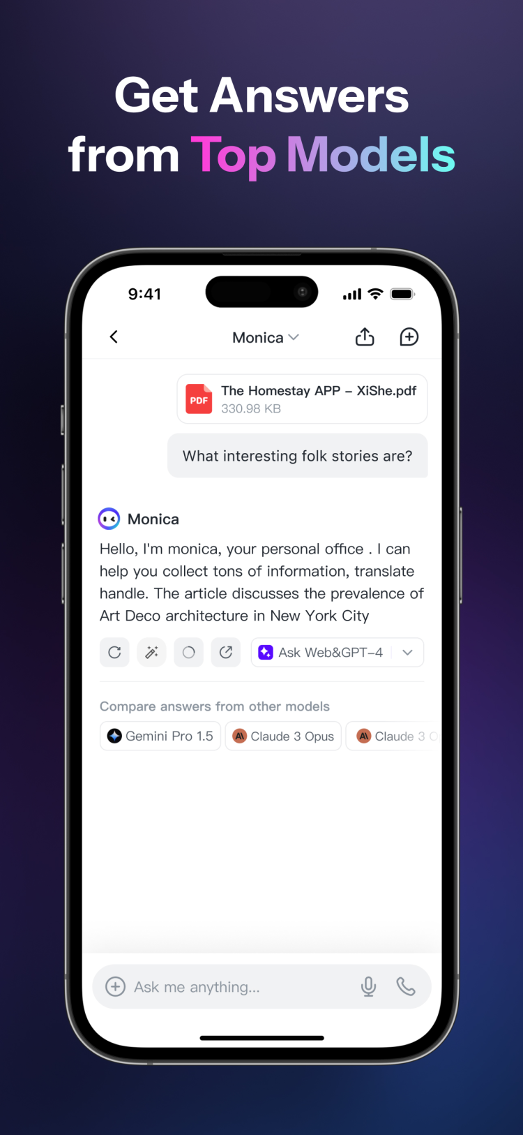 Все больше пользователей смартфонов обращаются к чат-ботам и помощникам на базе ИИ. И это неудивительно: преимущества искусственного интеллекта значительно облегчают жизнь, позволяя быстро находить нужную информацию, генерировать идеи, тексты и изображения, а также быстро обрабатывать огромные объемы информации. Monica AI не является исключением. Перед вами надежный и функциональный помощник на базе передовых технологий искусственного интеллекта. В отличие от традиционных чат-ботов, эта программа не ограничивается какой-то своей языковой моделью. В последней версии Monica AI вы можете выбирать из обширного списка, включая: