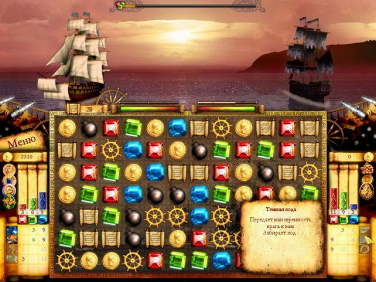 Ходы в этой игре делаются по очереди с противником. Двигая драгоценные камни, бомбы и свитки по игровому полю, собирая из них линейки по три элемента, вы будете вести ожесточенные бои. Каждая игровая фишка обладает своим свойством. Пузатые бомбы отправят в сторону врага меткий залп, значки со штурвалами заставят ваш корабль совершить витиеватый маневр, а кристаллы добавят маны. Собрав достаточное ее количество, вы сможете использовать против своего врага заклинания и боевую магию. Сюжет этой головоломки настоящий роман, в котором переплелись быль и вымысел, морские приключения и логические задачки.