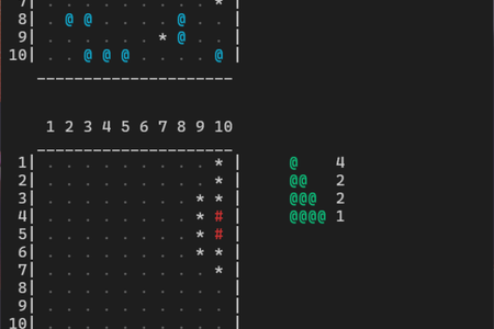 . — Пустая клетка * — Мимо @ — Ваш корабль + — Ранил # — Убил