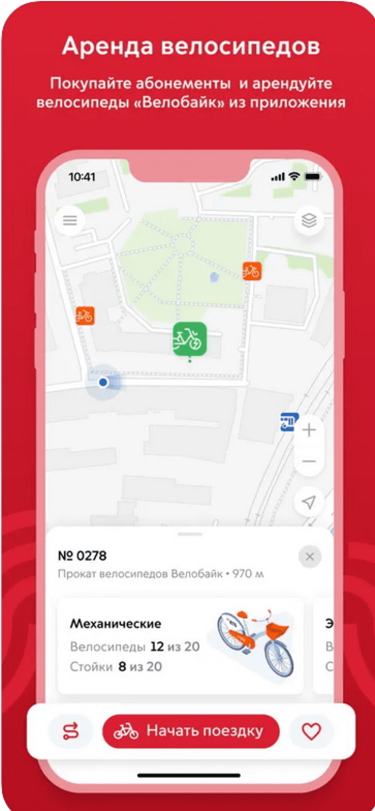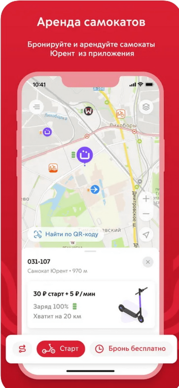 - поиск ближайших станций велопроката с возможностью забронировать самокат;