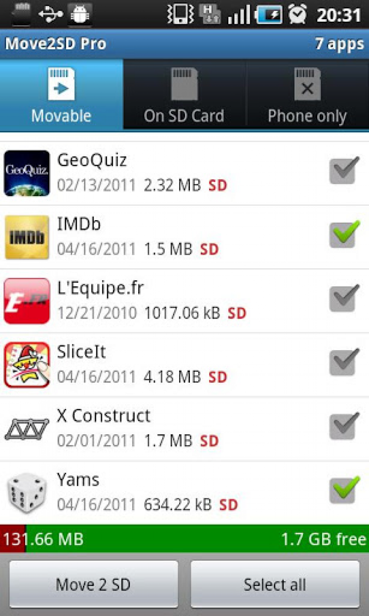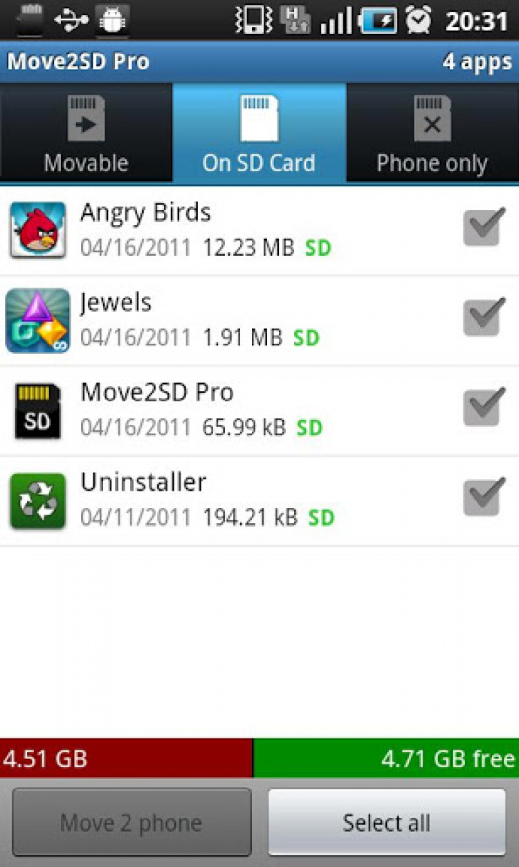 Move 2 SD Бесплатный инструмент для очистки памяти мобильных устройств на Android, путем перемещения приложений на SD-карту. Программа Move 2 SD предоставит вам список программ, которые можно перемещать на SD-карту и обратно, а так же список приложений, которые переместить невозможно. Вы сможете просматривать размер приложений и дату их установки, а так же удалять ненужные приложения.