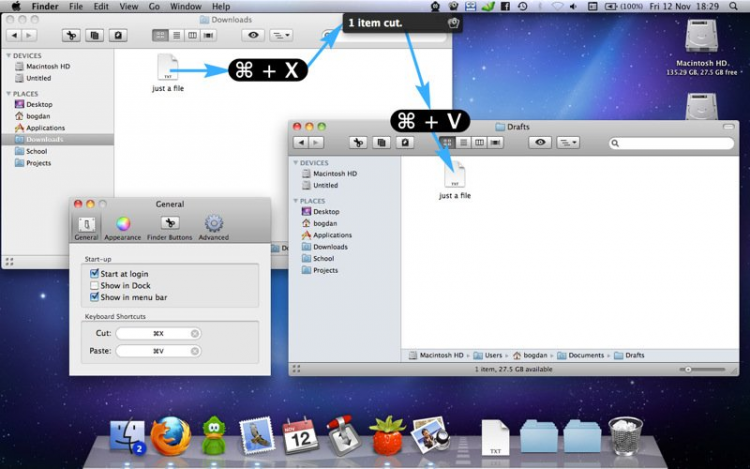 moveAddict Позволяет настраивать сочетания клавиш для перемещения, копирования и вставки файлов без помощи мыши. В дополнение к этому, moveAddict позволяет объединять несколько папок в одну.