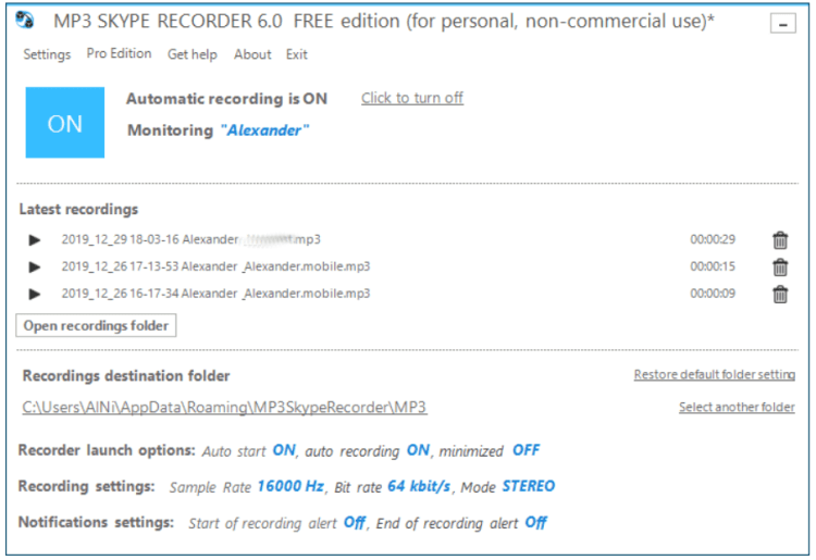 Больше MP3 Skype Recorder не требует никаких настроек. Программа готова к работе сразу после установки. Так что это отличный выбор, если вам нужна простая в обращении программа для автоматической записи звонков в Skype.