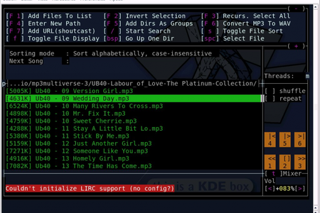 mp3blaster Один из самых популярных консольных медиапроигрывателей для Unix-подобных операционных систем. Имеет уникальную возможность разделения списка проигрываемых композиций на группы (альбомы), причём во время воспроизведения.