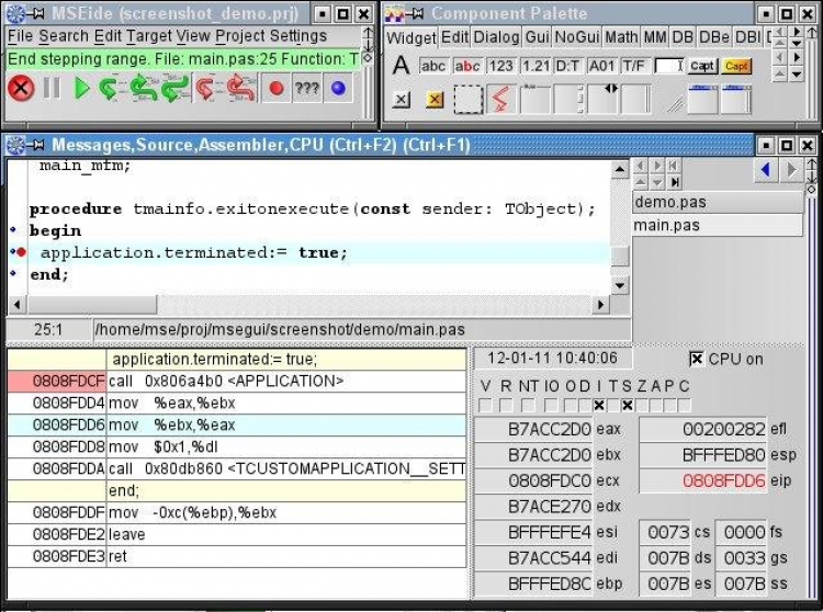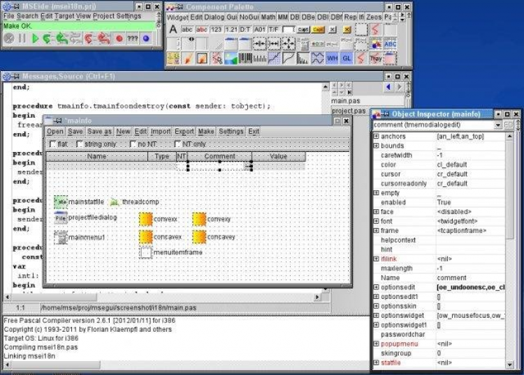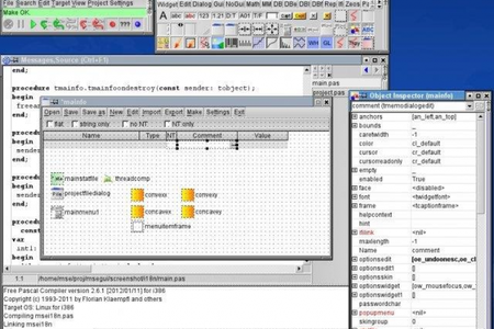 MSE Среда визуального программирования с использованием компилятора Free Pascal. Состоит из библиотеки визуальных компонентов MSEgui и редактора форм и исходных текстов MSEide. Имеет встроенный отладчик, подсветку синтаксиса, автозавершение полей классов, навигацию по коду, генератор отчётов и т. д.