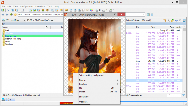 Multi Commander может работать с файлами на локальных и сетевых дисках, а также на удаленном FTP-сервере. Для этого в программе есть встроенный FTP-клиент. Кроме этого файловый менеджер также обладает собственным просмотрщиком изображения и редактором тегов, и может работать с архивами Zip, 7-Zip, Rar, Tar, GZ, Bz2 и Jar.