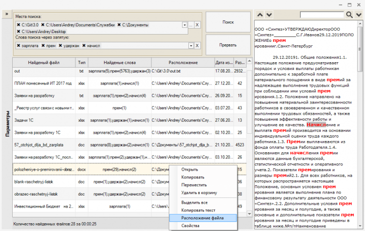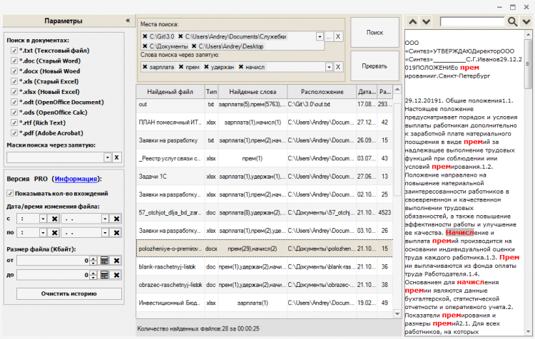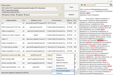 Бывают ситуации, когда нужно найти документы, но нет точного параметра для поиска, например, то ли ООО «Сервис», то ли ООО «Сервер» или «Север», или документы, в которых есть слово «зарплата», или слово «удержание», или «начисление». Данная программа найдет все документы, в которых есть заданные слова/словосочетания, укажет что нашла и покажет в каком контексте они используются.