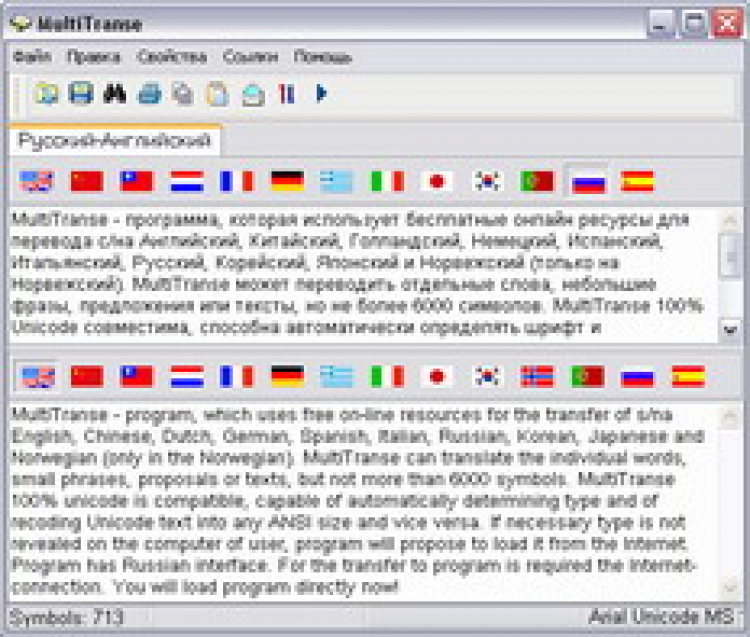 MultiTranse - это программа, которая использует бесплатные онлайн ресурсы для перевода с/на Английский, Арабский, Китайский, Голландский, Немецкий, Испанский, Итальянский, Русский, Корейский и Японский. MultiTranse может переводить отдельные слова, небольшие фразы, предложения или тексты, но не более 6000 символов.