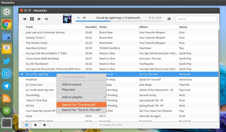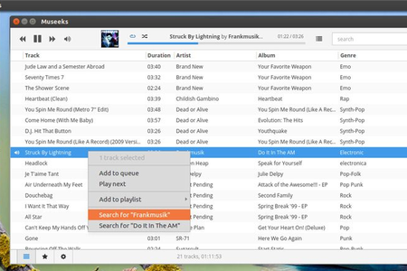 Museeks воспроизводит аудио файлы в формате MP3, OGG и WAV, обеспечивая только самые необходимые функции, которые могут потребоваться от аудио плеера. Он предлагает пару режимов воспроизведения, удобный менеджер плейлистов, поиск треков и менеджер очереди воспроизведения. А для любителей катсомизации тут есть темная и светлая темы.