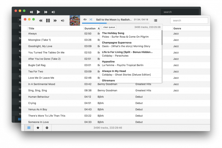Museeks - аудио плеер без наворотов. Имеет лаконичный интерфейс, позволяет слушать музыку не отвлекаясь на кучу непонятных панелей и кнопок. Понимает форматы MP3, OGG и WAV. Имеет встроенный менеджер плейлистов, функцию поиска, две темы (темную и светлую). Все нужно для нетребовательного пользователя.