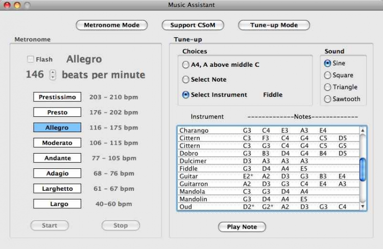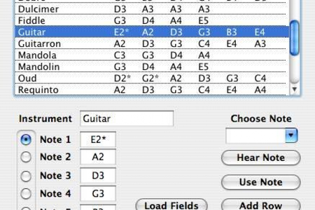 Во время настройки интструментов вы можете прослушать любую ноту, или выбрать уже заготовленную информацию для инструмента.