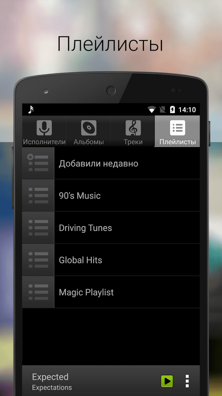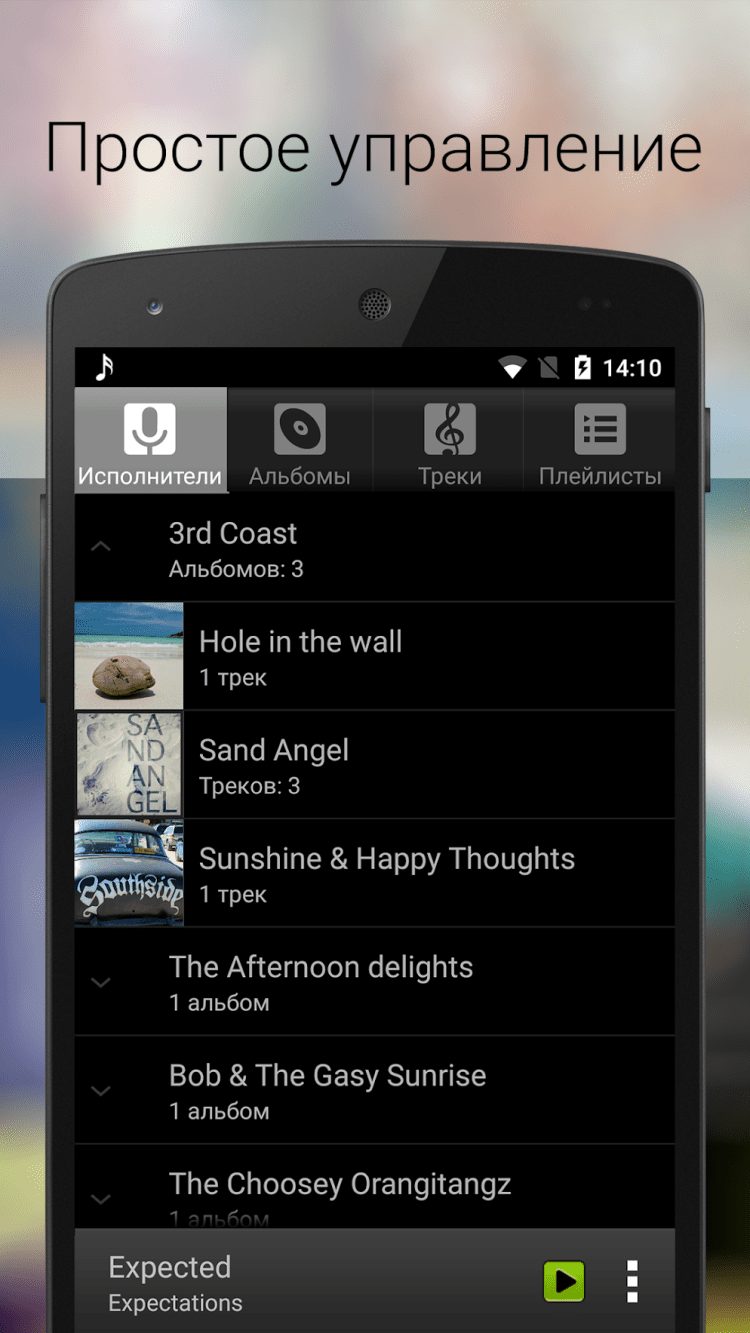 Android Music Player Музыкальный проигрыватель, сделанный на основе основного проигрывателя Android 2.3, поддерживающий версии операционной системы 4.4 и новее. Этот проигрыватель включает в себя встроенный эквалайзер, просмотр жанров, содержит меню для управления в режиме блокировки экрана и многое другое.