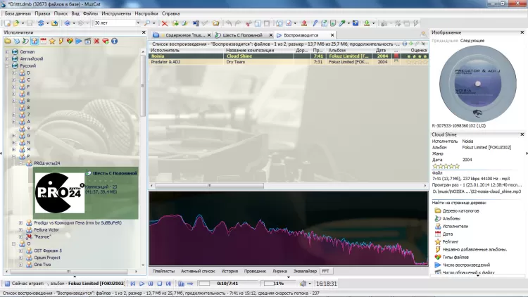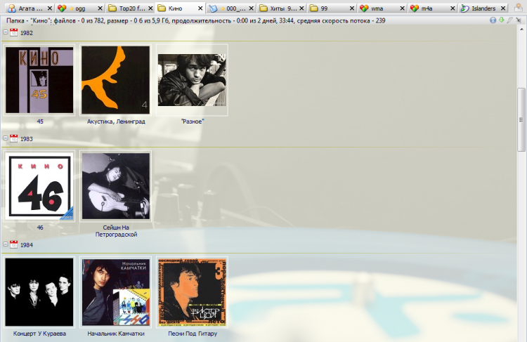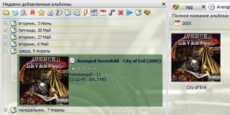 - просмотр детальной информации о файлах в многостраничном списке или в виде эскизов альбомов с возможностью их группировки по различным полям тегов;