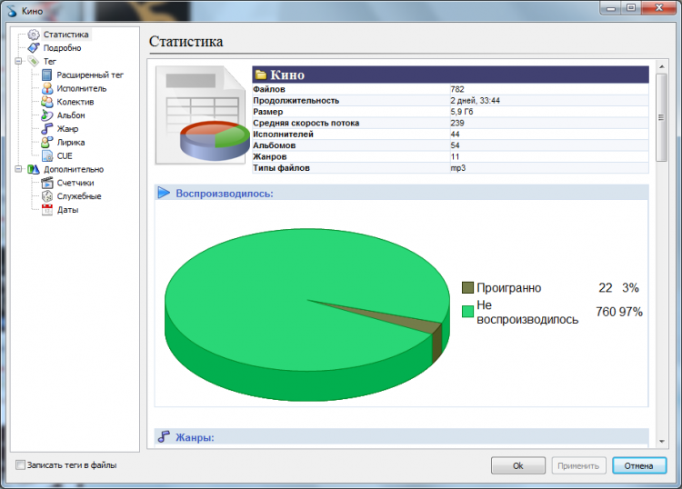 Каталогизатор (библиотека мультимедиа) с наглядным представлением коллекции, возможностью быстрого поиска музыки и ведения статистики, воспроизведения файлов как встроенным, так и сторонним медиа плеером, профессиональный редактор тегов с широкими возможностями, поддержкой тегов mp3, ogg, wma, flac и других распространенных форматов.