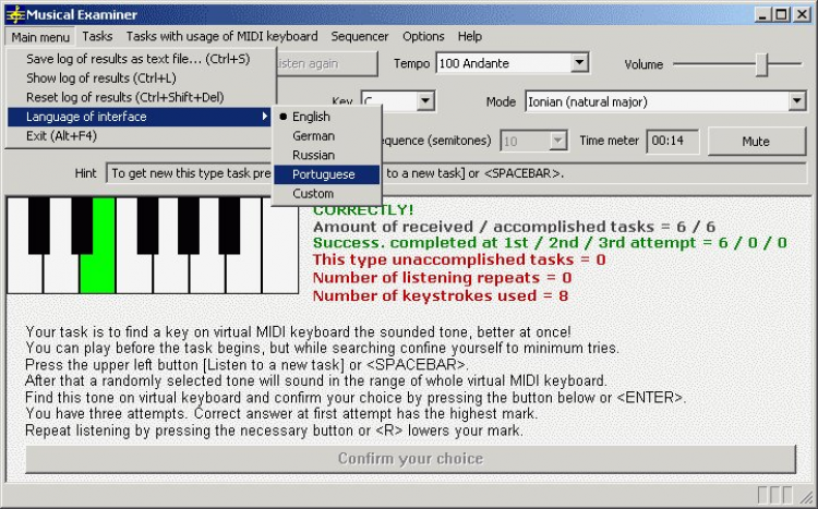 - Программа проверяет (и тренирует) вашу музыкальную память. Для этого есть упражнения для запоминания не только одного тона, но и мелодические цепочки из двух, четырёх и восьми нот. Все задания генерируются программой, поэтому повтор последовательностей звуков при каждом новом включении программы исключён.